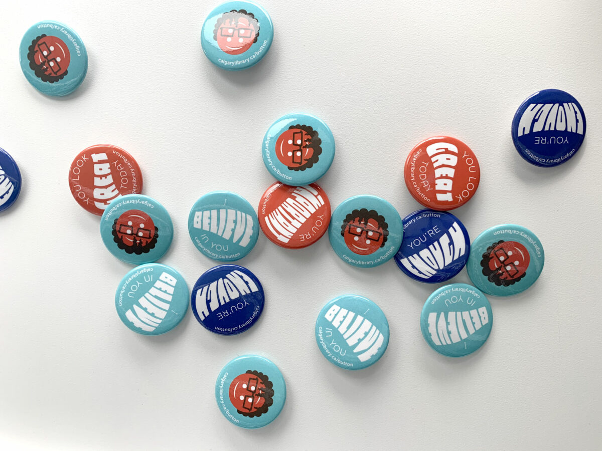 Button’s Buttons was a series of five collectible buttons that members could collect when they visited any Library location. The buttons displayed uplifting phrases and were meant to encourage positivity and empathy in our communities. One even featured the Button Family icon!