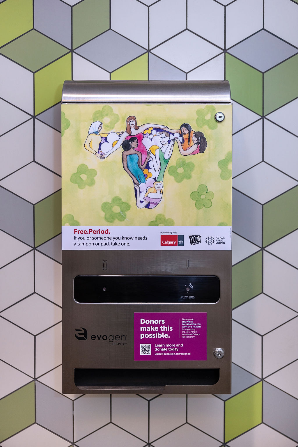 Donor support provides free menstrual products in Calgary Public Library restrooms.